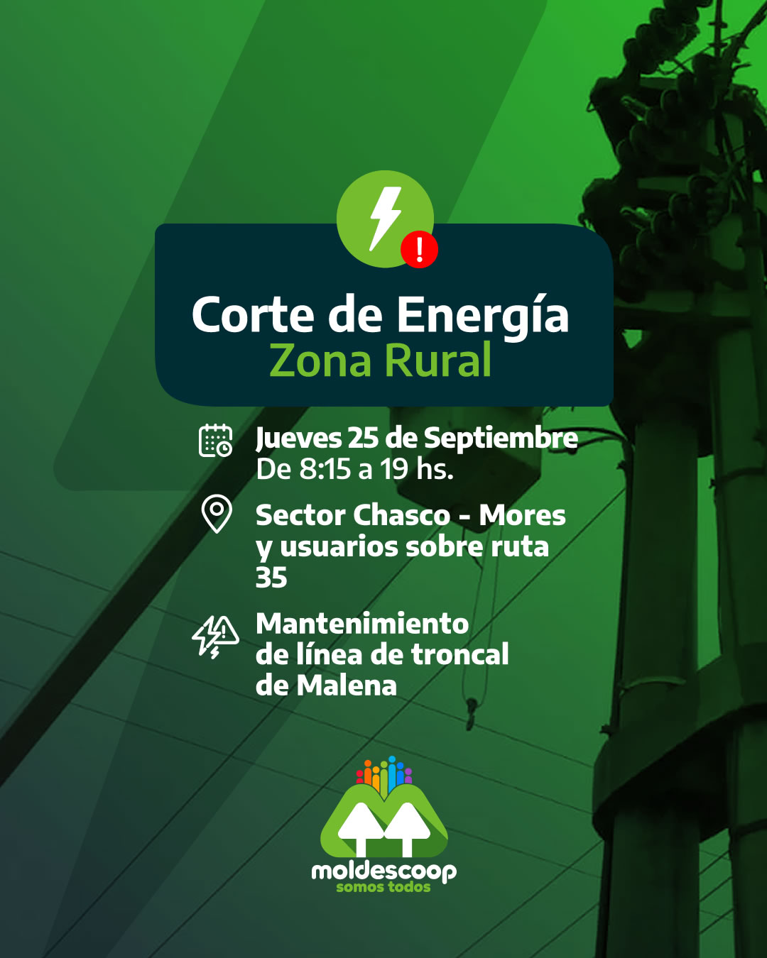 El jueves 25 de septiembre, desde las 8:15 hasta las 19:00 hs, se realizará un corte de energía por tareas de mantenimiento en la línea troncal Malena. La interrupción comprenderá la derivación Chasco – Mores y a los usuarios ubicados sobre Ruta 35.