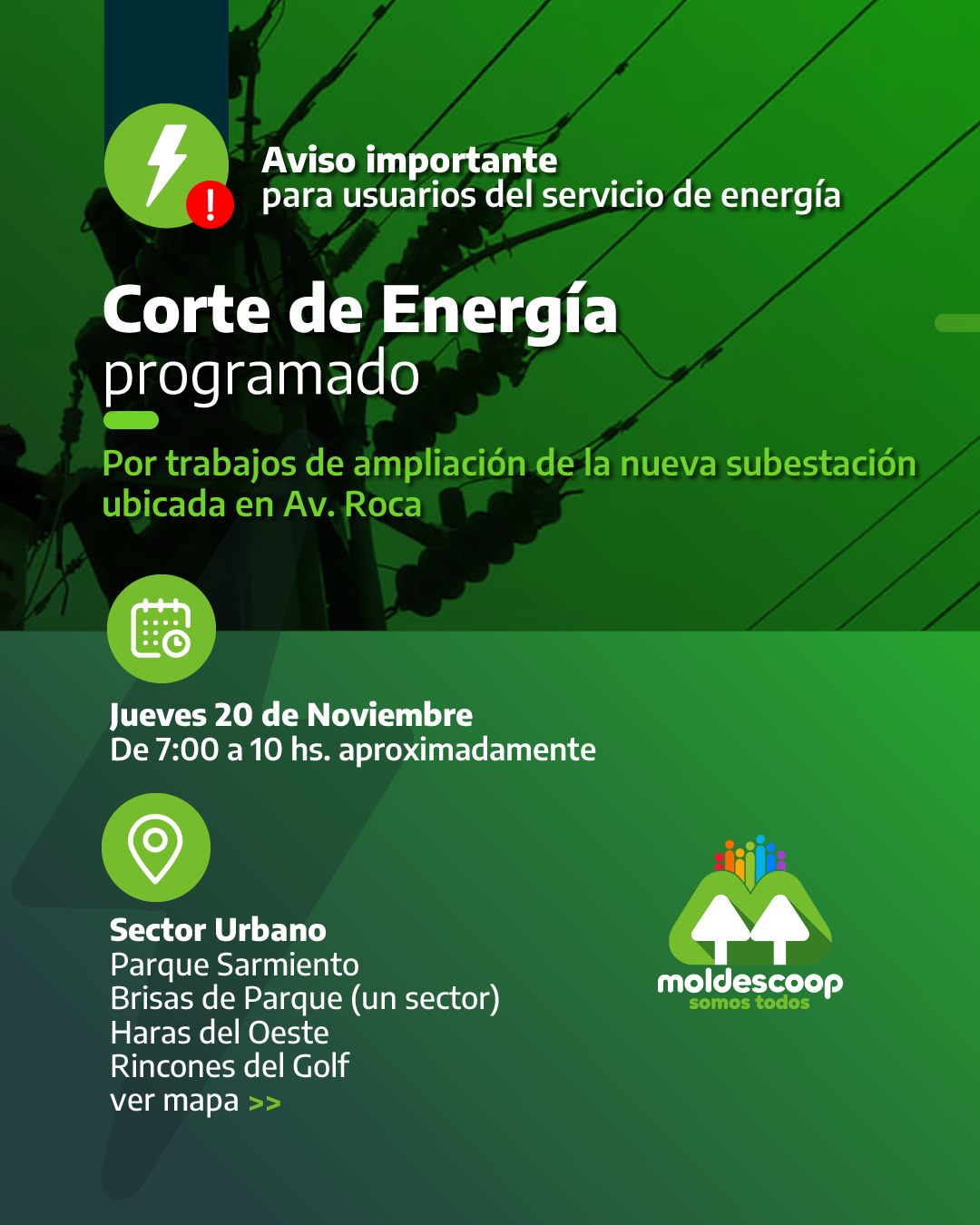 Este jueves 20 de noviembre se realizará un corte programado de energía de 7:00 a 10:00 hs, aproximadamente, debido a los trabajos de ampliación de la nueva subestación ubicada en Av. Roca.