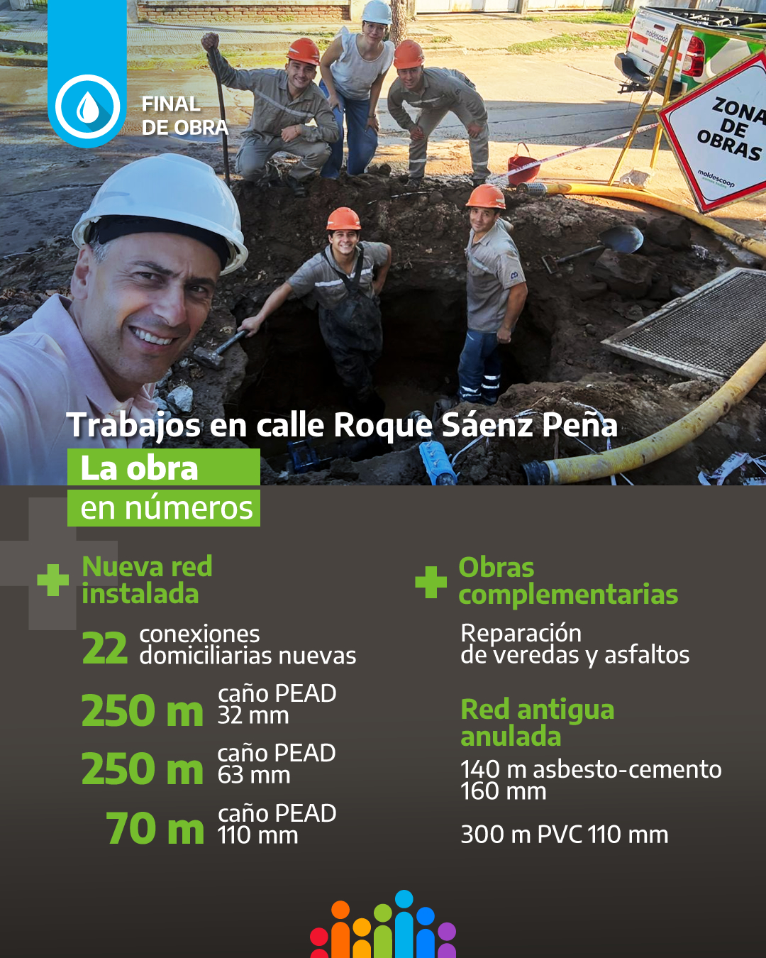 Luego de varios meses de trabajo —desde septiembre de 2025 hasta hoy— el Área Agua completó las obras complementarias y la extensión de red por vereda en calle Roque Sáenz Peña, del 0 al 100, dejando definitivamente anulada la antigua cañería de asbesto-cemento de esa cuadra.